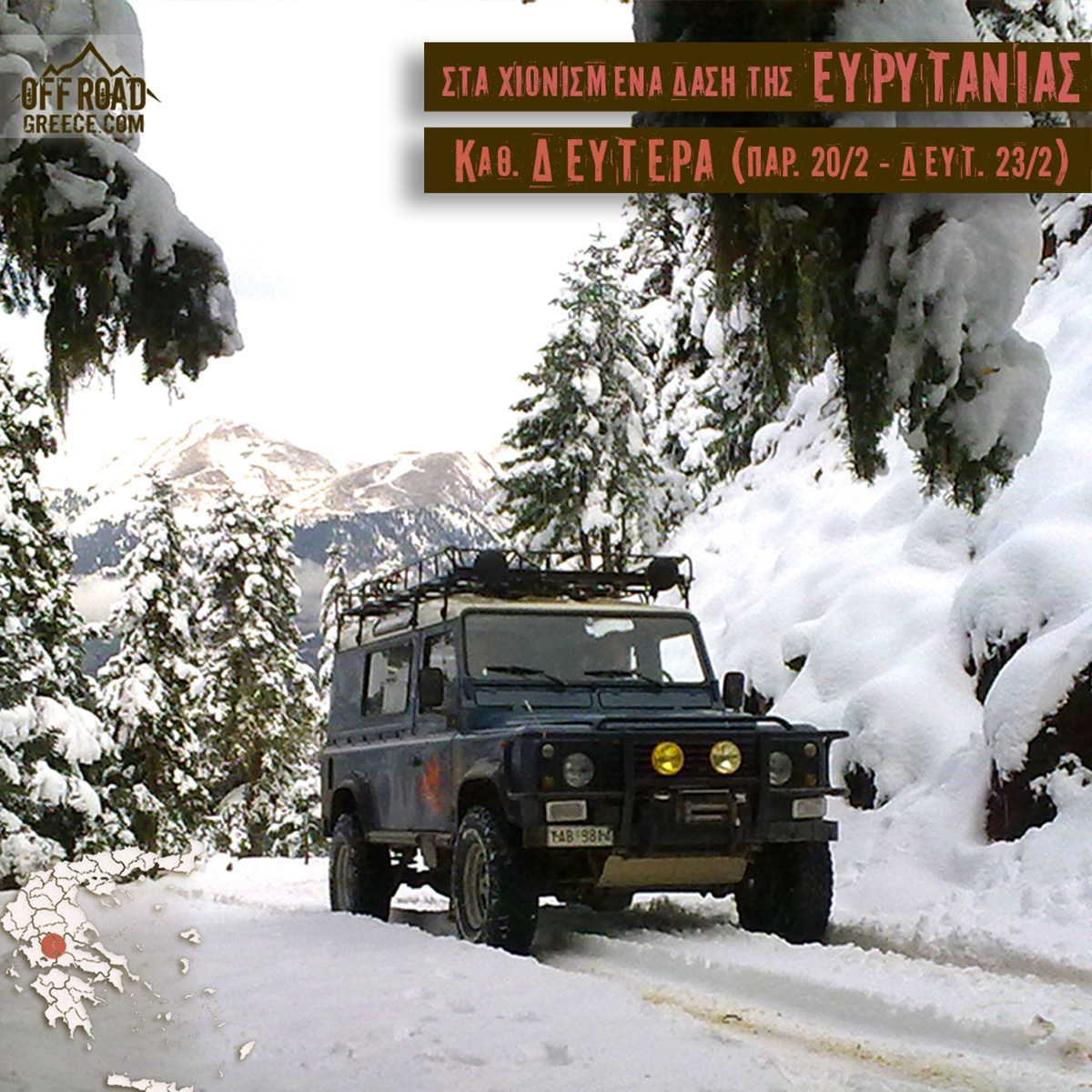 Εκδρομές για οχήματα με αυξημένες δυνατότητες στην εκτός δρόμου οδήγηση. Απαραίτητη προϋπόθεση να διαθέτουν Αργές Σχέσεις ή Ηλεκτρονικά Συστήματα εκτός δρόμου και minimum All-Terrain Ελαστικά.