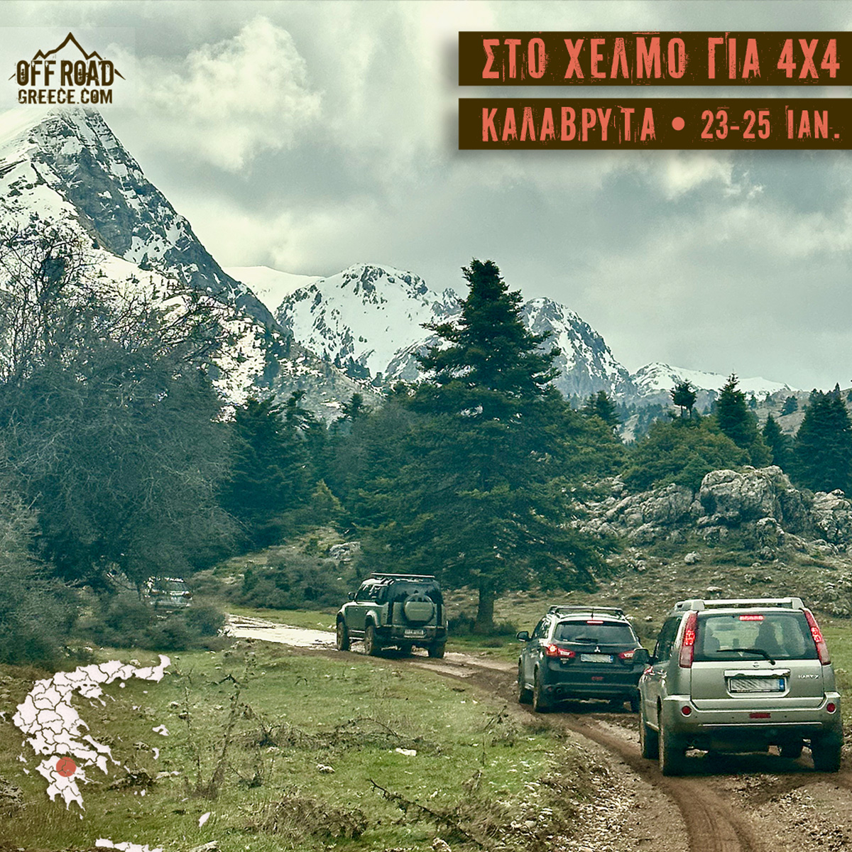Εκδρομές για οχήματα με αυξημένες δυνατότητες στην εκτός δρόμου οδήγηση. Απαραίτητη προϋπόθεση να διαθέτουν Αργές Σχέσεις ή Ηλεκτρονικά Συστήματα εκτός δρόμου και minimum All-Terrain Ελαστικά.