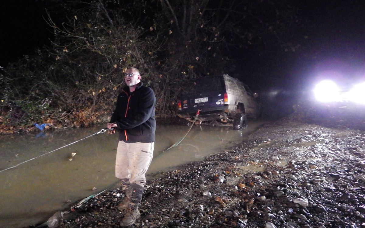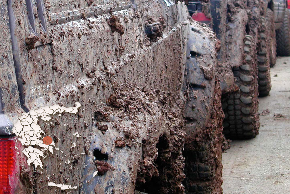 Mostly rough, sometimes not trafficked terrain with heavy vegetation. Mud, clay, mud, extreme entanglement and steep passages. Deep water, large stones. Recovery strap and winchs are constantly in use.